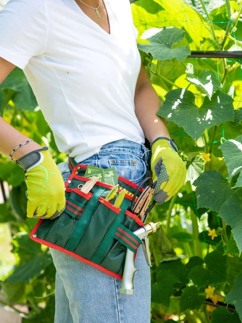 Ever put a tool down to attend to something else, and then forget where you put it? Or haven’t been able to see it for all the long grass? With this tool belt, those frustrations are a thing of the past! The three front pockets are ideal for small hand tools and a marking pen. An additional, larger pocket is perfect for keeping plant ties, twine or seed packets at hand and organized.